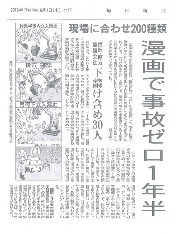 毎日新聞に、KY活動用マンガ看板を用いた安全対策の成果が取り上げられました。